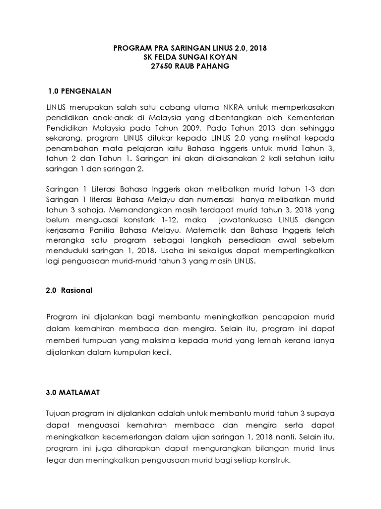 Nkra kementerian pendidikan malaysia untuk linus nkra saps nkra. Tarikh pelaksanaan saringan linus 2.0 tahun 2018 perkara saringan 1 saringan 2 saringan berperingkat mengikut sekolah. 8:29 am koleksi saringan linus no comments. Muat turun di sini : Pelaksanaan saringan linus tidak mengikut jadual yang ditetapkan.