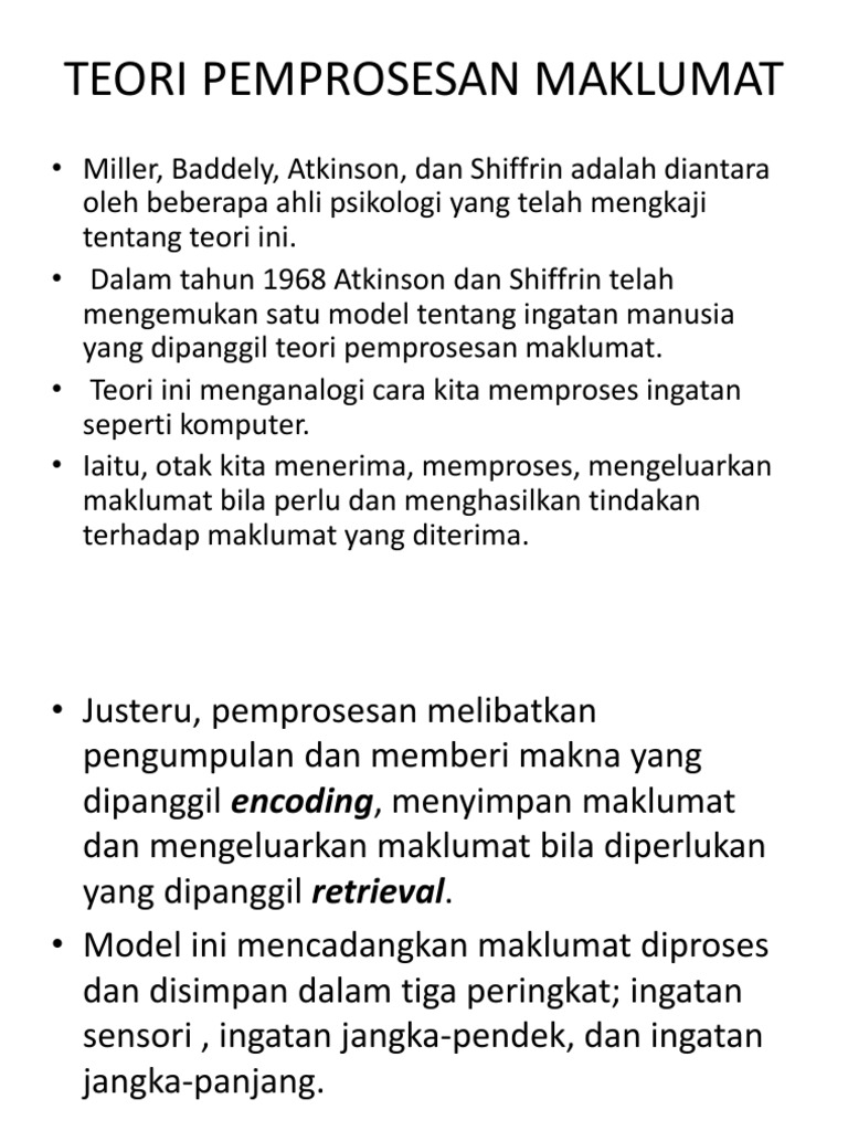 Exam Kognitif Bab 31 Ppt Ppt Powerpoint from reader012.fdokumen.site Text of teori pemprosesan maklumat. Terimakasih sudah mampir ke channel ini. Teori pemrosesan informasi merupakan salah satu bagian dari teori belajar sibernetik. Dalam tinjauan psikologi kognitif belajar diartikan sebagai the process of acquiring knowledge. Ia juga merupakan set keseluruhan sistem perniagaan yang direka bentuk untuk menjalankan pemprosesan data yang rutin dan menjana maklumat untuk memudahkan membuat. Maklumat ini akan ditafsir dalam stor ingatan, kemudian dihantar kepada stor ingatan jangka panjang dan akhirnya kepada penggerak tindak balas melalui sistem saraf. Artinya kita masih banyak mengutip pendapat pakar dari. Apakah wudhuk?membasuh anggota tertentu dengan menggunakan air mutlak.air mutlak???